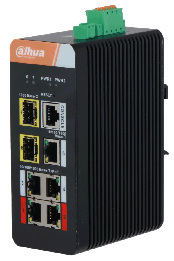 Порты: 4 RJ45 10/100/1000Мбит/с (PoE/PoE+/Hi-PoE), 1 RJ45 10/100/1000Мбит/с (uplink), 2 SFP 1000Мбит/с (uplink); мощность PoE: порты 1~2 до 90Вт, порты 3~4 до 30Вт, суммарно до 120Вт; PoE watchdog, передача до 250м; питание: 9~57В(DC); грозозащита: до 6кВ; рабочая температура: -40°С~+75°С; монтаж на DIN-рейку